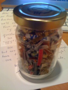 First, unless you are this couple you have no idea who they are. I know, being broke and living without a plan will sound like someone you know or, worse, you! Regardless of the similarities, it is not who you think it is. However, if you have been in my office in the last 24 months, you will recognize the gift they left me on the last day of working the program. This jar sits on my desk and holds fifteen shredded credit cards! Many think that the jar is full of cards from many people – they are from one couple.